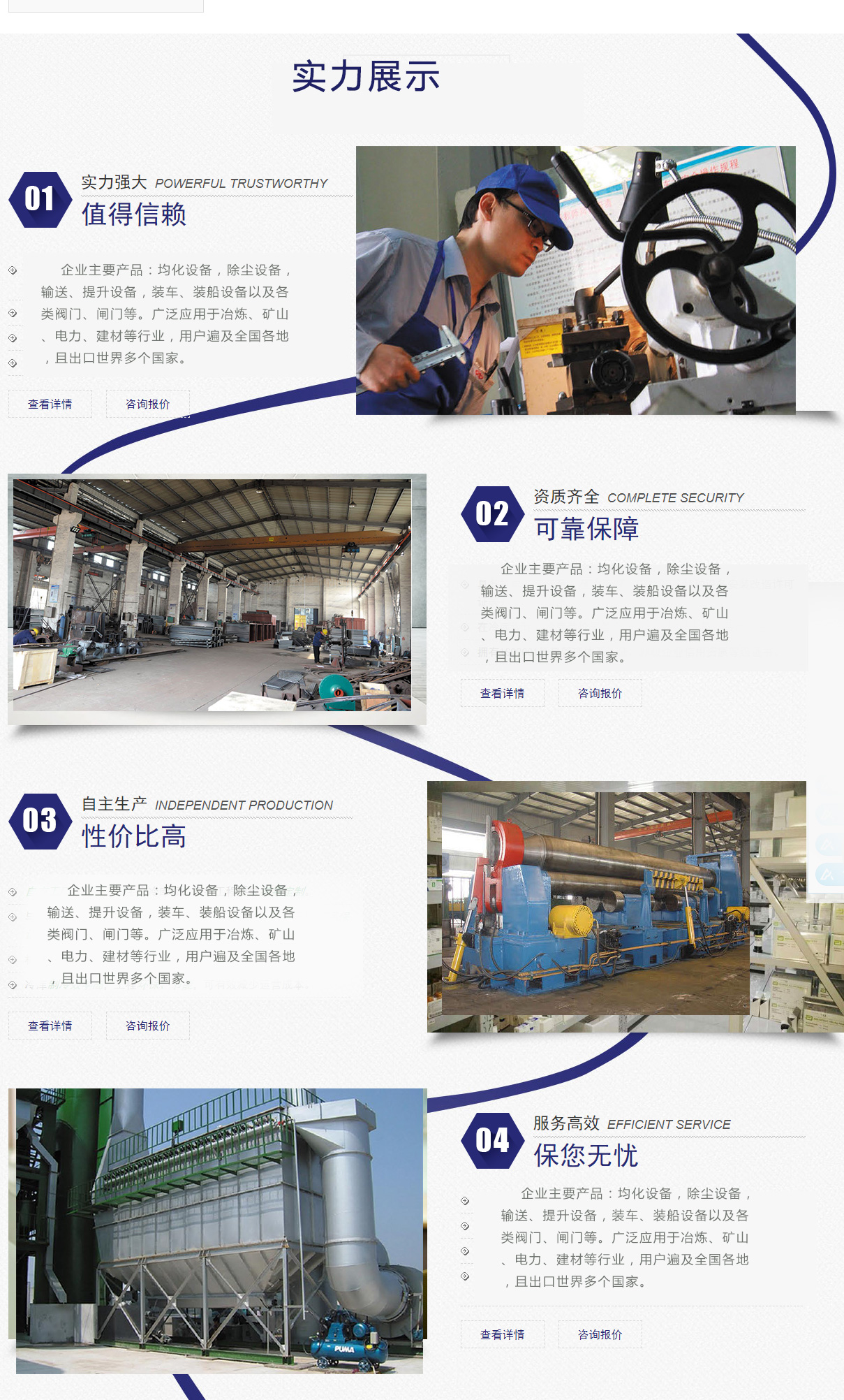 企业主要产品:均化设备,除尘设备,输送、提升设备,装车、装船设备以及各类阀门、闸门等。广泛应用于冶炼、矿山、电力、建材等行业,用户遍及全国各地,且出口世界多个国家。